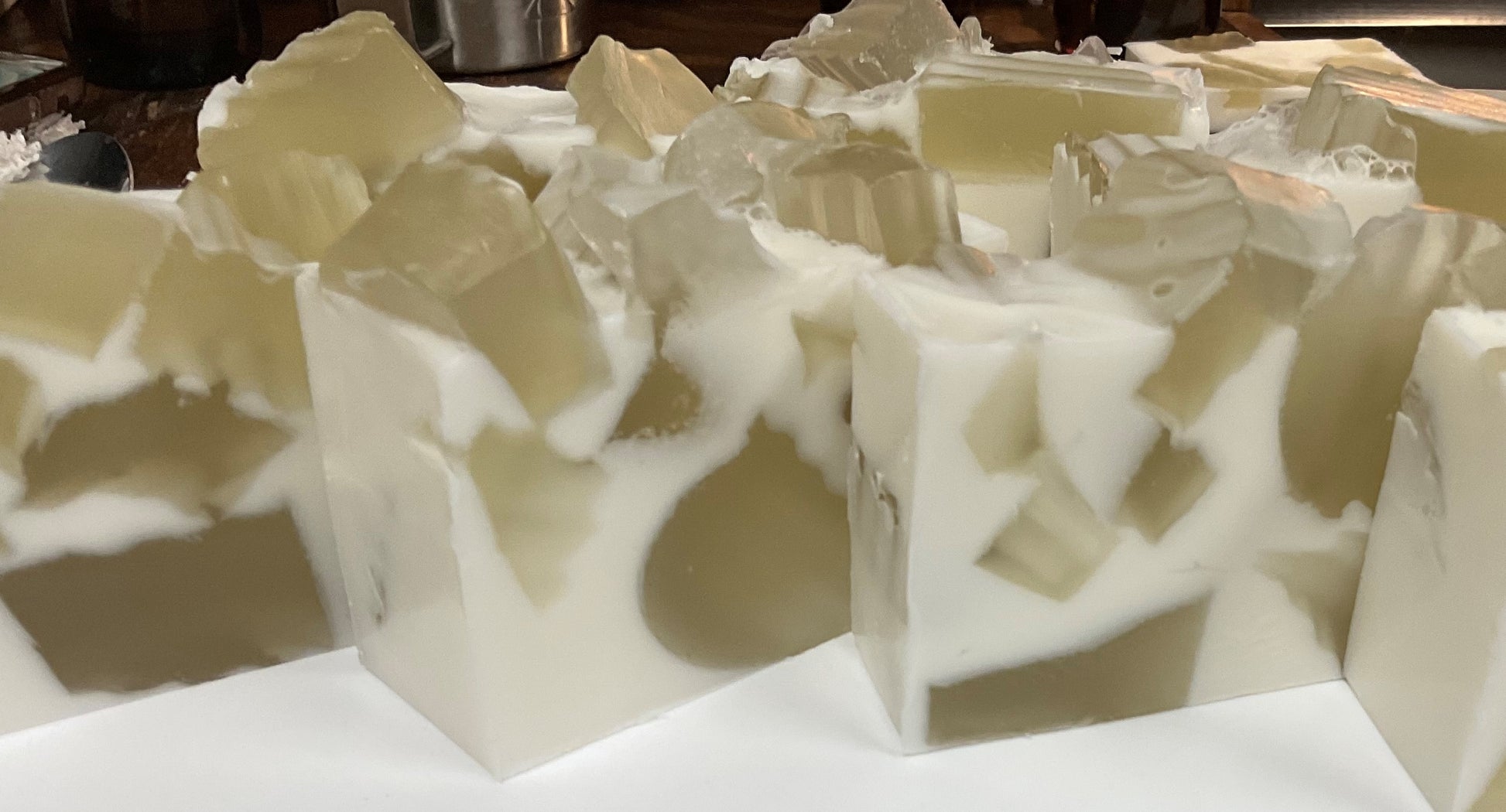 With the look of stone/Motor and the fresh scent of Man and clean linens; this soap will make you smile.